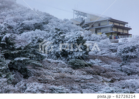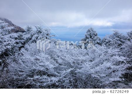 妙見岳の霧氷 雲仙 普賢岳、平成新山を望む