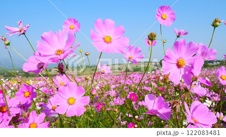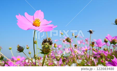 A field of beautiful pink cosmos flowers amidst a clear sky background