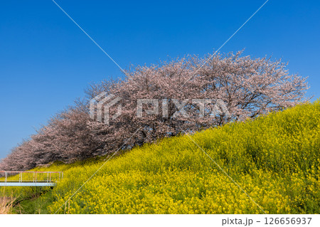 埼玉県熊谷市玉作 荒川支流の和田吉野川沿い玉作水門付近の桜並木 ソメイヨシノ並木と菜の花畑