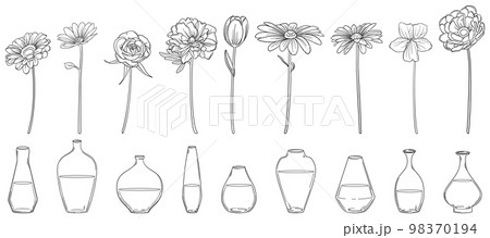 繊細な線画の花と一輪挿しの花瓶セット ベクター素材