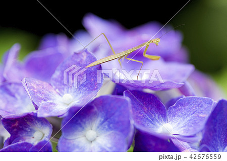 水色のあじさいの花の上に一匹の小さなカマキリ