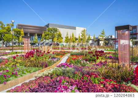 神奈川県 相模原麻溝公園のグリーンタワーと花いっぱいの大花壇