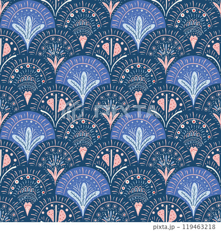Organic abstract scallop seamless pattern. Boho style arch decoration endless background. Folk repeat cover. Blue and pink surface pattern design scribble motif. Vector hand drawn illustration.