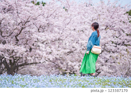 Girl at cherry tree and Nemophila garden, Uminonakamichi park, Fukuoka