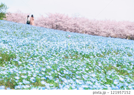 Nemophila with blur people and cherry blossom, Uminonakamichi