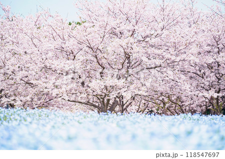 Nemophila and blur sakura tree, Uminonakamichi Park, Fukuoka
