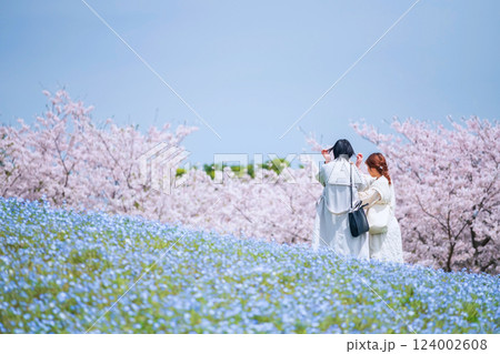 woman view pink sakura by Nemophila, Uminonakamichi Park, Fukuoka