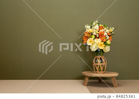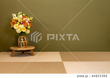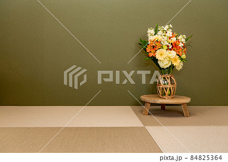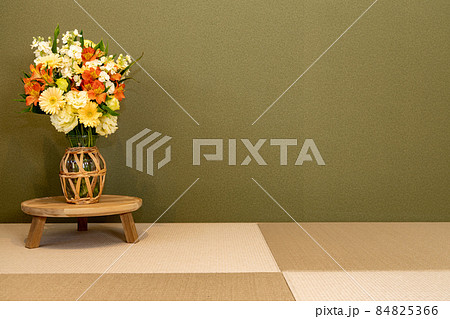 和室の抹茶色の壁紙の前に置いてある花瓶に生けてある花束