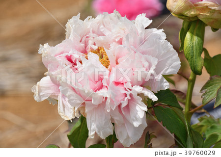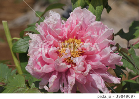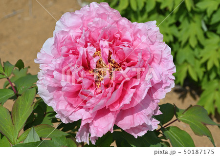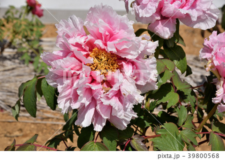 牡丹園にボタンの花が咲いています。このピンク色の牡丹の名前は花競(ハナキソイ)です。