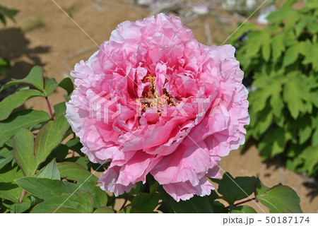 牡丹園にボタンの花が咲いています。このピンク色の牡丹の名前は花競(ハナキソイ)です。