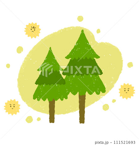 手描きの杉の木と飛び交う花粉