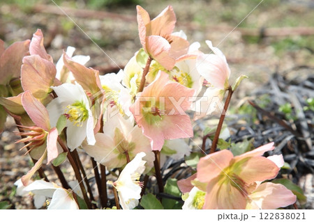 調布市深大寺元町の植物園に咲く白と淡いピンクのバラ(モダンローズ マチルダ)の花