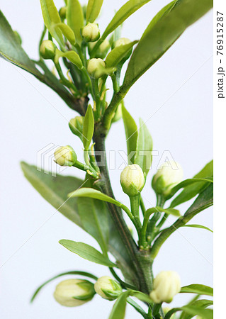 白バックに横位置で撮影したみかんの花芽(有葉花)