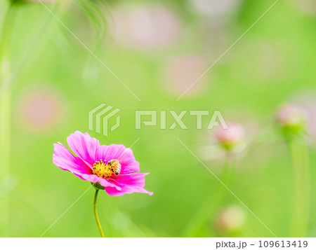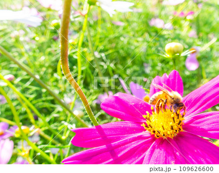 秋の景色 可憐でかわいいカラフルなコスモスの蜜を吸うミツバチ