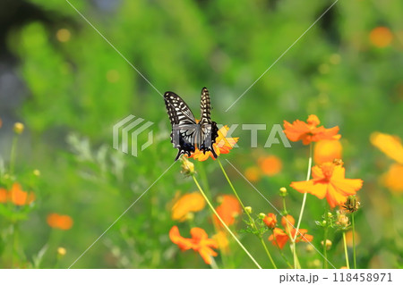 キバナコスモスの蜜を求めて飛び回るナミアゲハ