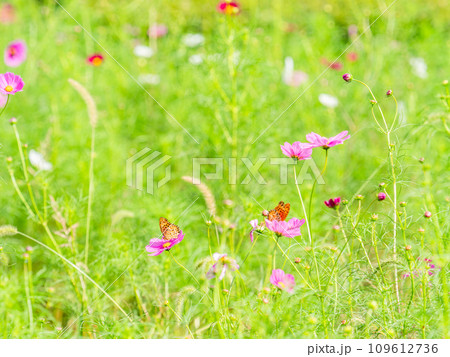 秋の景色 可憐でかわいいカラフルなコスモスの蜜を吸いに来たツマグロヒョウモン蝶