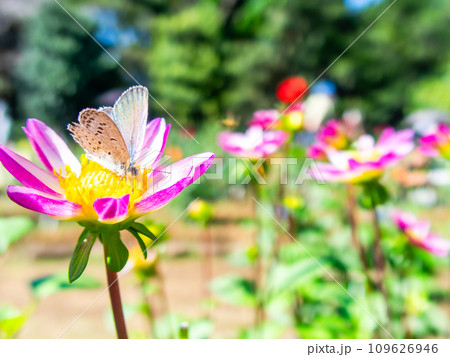 秋晴れの下、満開のダリアの蜜を吸いに来たかわいいシジミチョウ