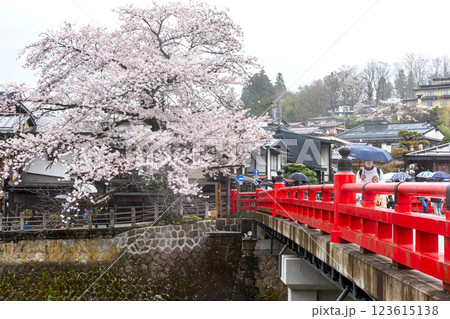 日本の岐阜県高山市 春の高山祭 満開の桜と中橋を渡る屋台の行列 美しい新緑と青空