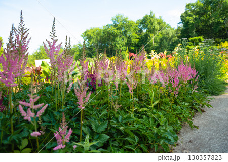Pink Astilbe arendsii flowers blooming in the summer garden, fluffy feathery plumes rising above green foliage along the pathway in bright sunlight.