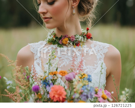 Bride in wedding dress with floral collar and wildflowers inspired by nature meadows
