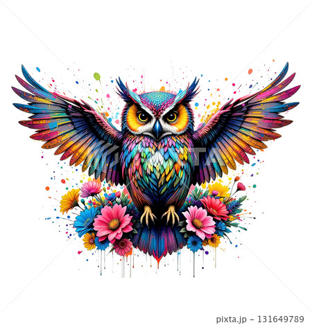 Symmetrically balanced illustration of an owl with outstretched wings, rendered in a stunning, kaleidoscopic color palette. Wild Animals. Bird.