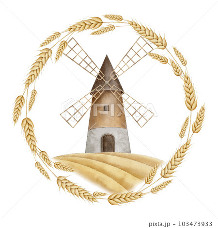 Watercolor windmill tower on wheat field in wheat wreath. Netherlands landscape. Hand drawn watercolor illustration for sticker, packaging, branding, labeling, cards, postcards, posters, souvenirs