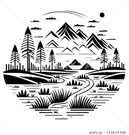 vector illustration a peaceful and serene countryside scene, with rolling hills, blooming flowers, and a winding river. nature themed publications, wellness blogs, or as artwork for relaxation spaces.
