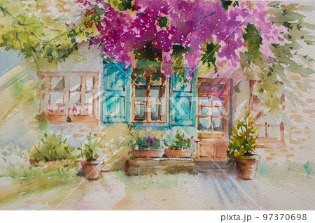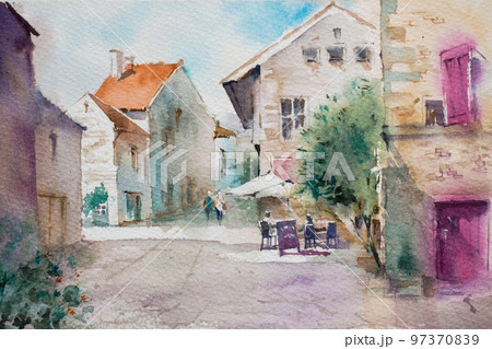ヨーロッパの古い街 プロヴァンスの水彩画 風景画