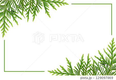 Twigs of thuya with buds in a corner arrangements with green frame isolated on white