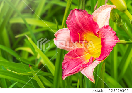 Beautiful pink day-lily in a summer garden