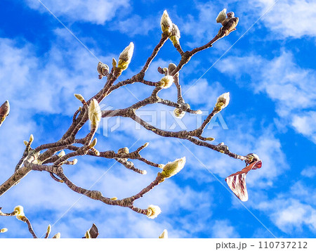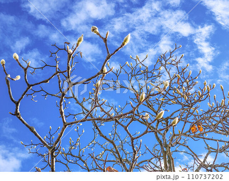 小春日和の青空とハクモクレンの白い花芽