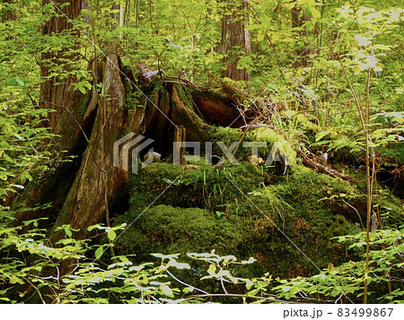 森の中の大きな切り株 木曽赤沢自然休養林の天然木曽ヒノキの林 古木 切り株