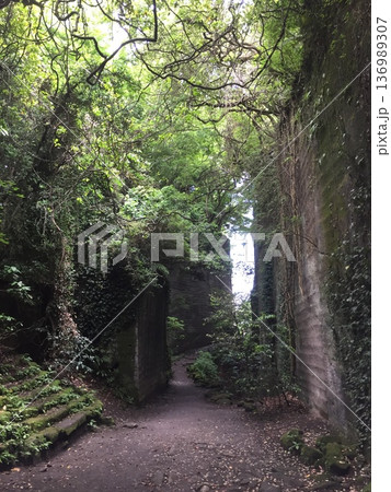 国指定史跡「朝夷奈切通」の垂直な岩壁 鎌倉時代から続く苔むした歴史的な古道と断崖の風景