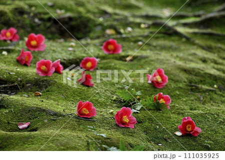 苔の原に落ちた椿の花