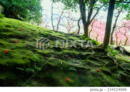城南宮の神苑、落椿と梅の花美しい春の風景