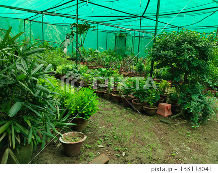 Organized arrangement of potted seedlings inside shade net house, diverse nursery plants growing in containers under filtered light, healthy propagation setup for ornamental and garden saplings in