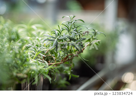 Small rosemary plant leans outward from pot in phyto light. Healthy food, self sustained herb food