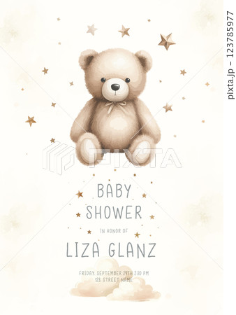 Cute baby shower watercolor invitation card for new born celebration. With plush toy teddy bear, clouds and stars.