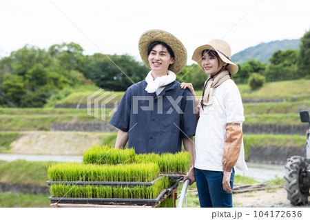 田植えをする若い夫婦