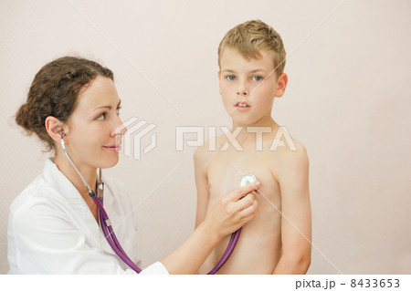 Doctor listens to lungs of little boy with stethoscope