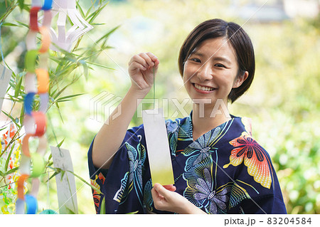 七夕の短冊を飾る浴衣姿の女性