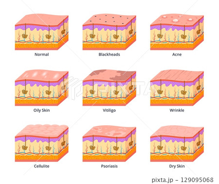 Various skin types scheme. Different skin diseases, layers section, medical infographics, epidermis with problems, blackheads, acne and vitiligo. Wrinkle and psoriasis nowaday vector set