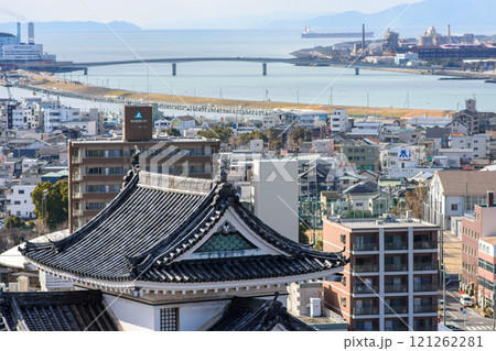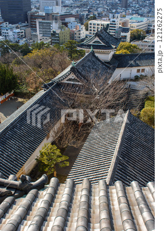 Rooftop of Wakayama castle, old historic Japanese castle in Wakayama city in Kansai region, Japan