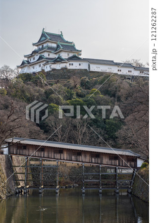 Bridge over water moat at the entrance of Wakayama castle, old historic Japanese castle in Wakayama city in Kansai, Japan