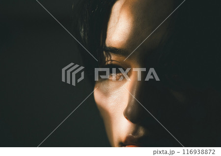 若い日本人女性の横顔。白い背景に自然光が差し込む美しいポートレート