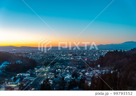 会津若松市の町並み 冬 雪景色 夕景