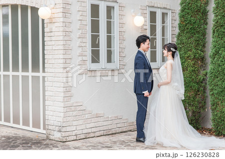 結婚式で結婚式場のガーデンにいる新郎新婦(ガーデンウェディング)