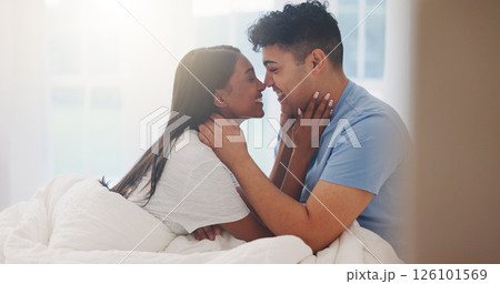 Couple, nose touch and love in bedroom together, affection and bonding with commitment for trust in home. Romance, partner and happy in healthy relationship, eskimo kiss and interracial people in bed
