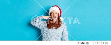 Winter holidays and Christmas Eve concept. Happy teenage girl with red hair, wearing santa hat, enjoying New Year, showing peace sign and gazing left at promo, standing over blue background