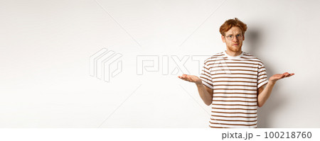Confused boyfriend with red hair shrugging, spread hands sideways and staring at camera puzzled, asking what, stnading over white background